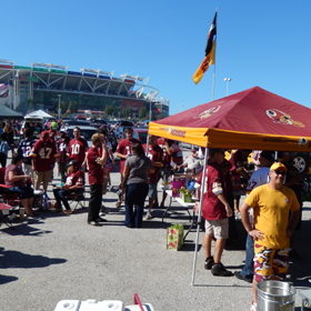 Our tailgate always starts the moment the parking lot opens (5 hours before game time) and we start packing up around 30 minutes before game time so we have plenty of time to head into FedEx Field. Many of us arrive even earlier to do a bit of pre-tailgating on Redskins Road before the lot is opened, and you can usually find a bunch of us at the very front of the line waiting for the parking lots to open. Our tailgate is typically located in
